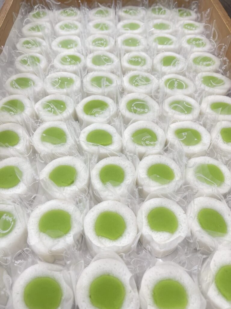 春らしい若緑色の備中白小豆こしあんを軽羹でふわっと巻いてくださいとの事。少し厚めの軽羹で仕上げました。