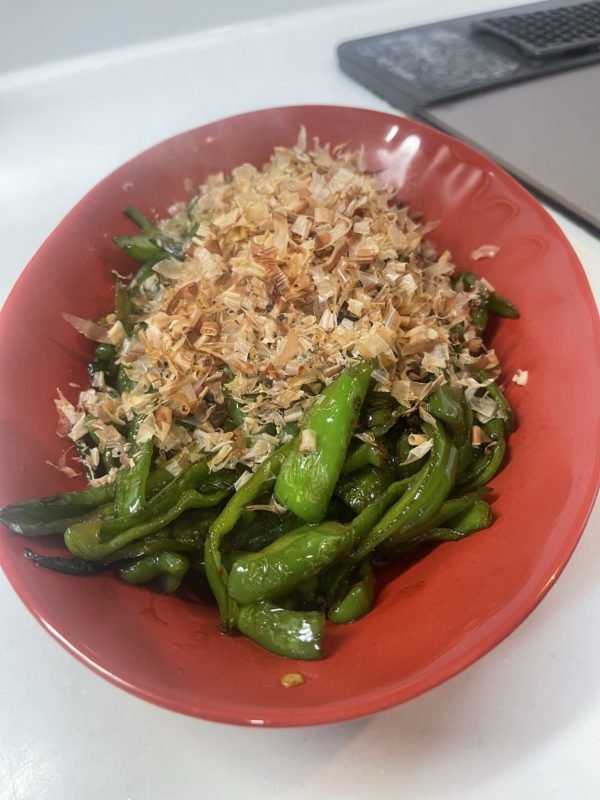 伊丹十三さんがエッセイで書かれていたピーマンと鰹節のおかずを添えてのシンプルな夕ご飯。