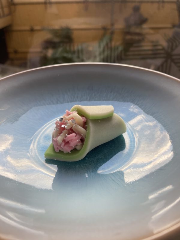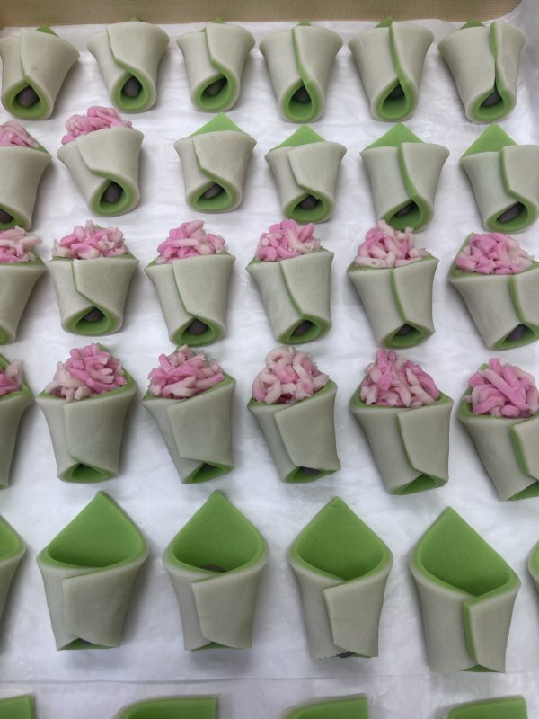 花束をモチーフにしたこなし製の生菓子。花束の中心には薄紅色のきんとんのお花を、キラキラと銀箔を散らして完成です。