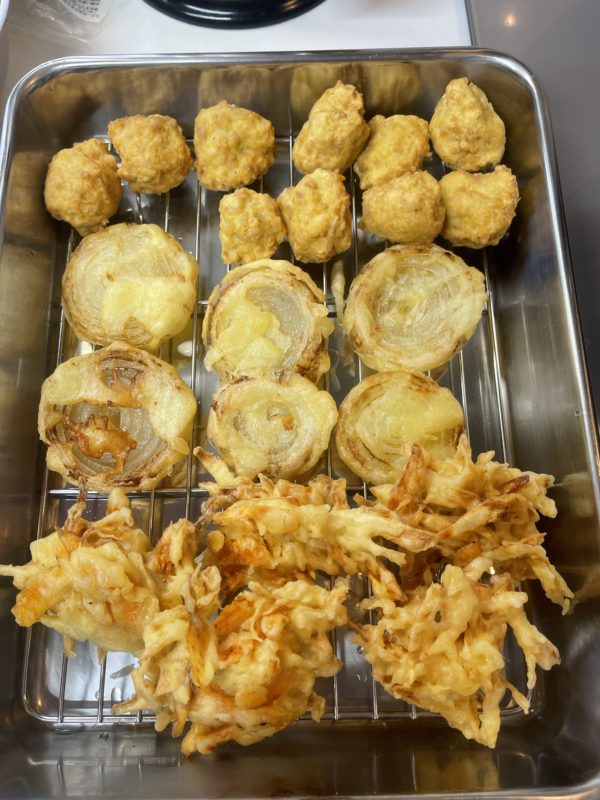 定番のかまぼこと白ネギはもちろんのこと、玉ねぎの輪切りの天ぷら、ごぼうとにんじんのかき揚げもつくりました。