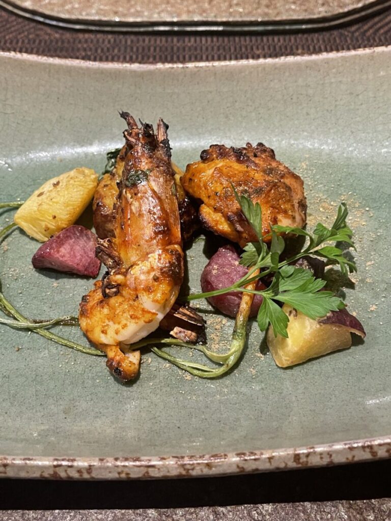 スパイスに漬け込まれた海老と豚肉とチキン。
