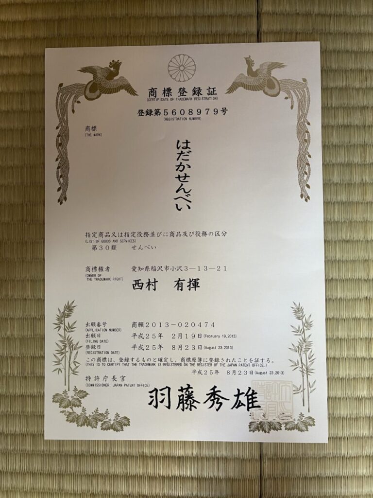 松屋長春の和菓子に「はだかせんべい」があります。「はだか」という名前を使うには商標を登録する必要があります。