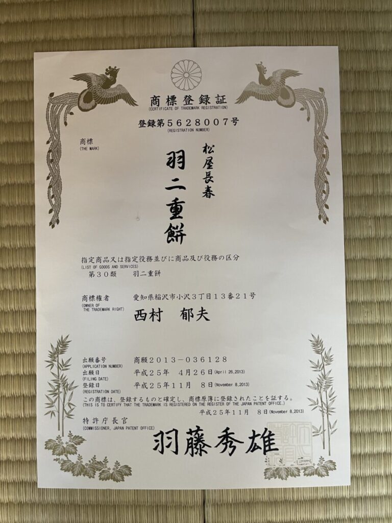 私は「松屋長春」の他に「なおい」、「はだか」、そして「羽二重餅」と全部で四つの商標を登録し保有しています。