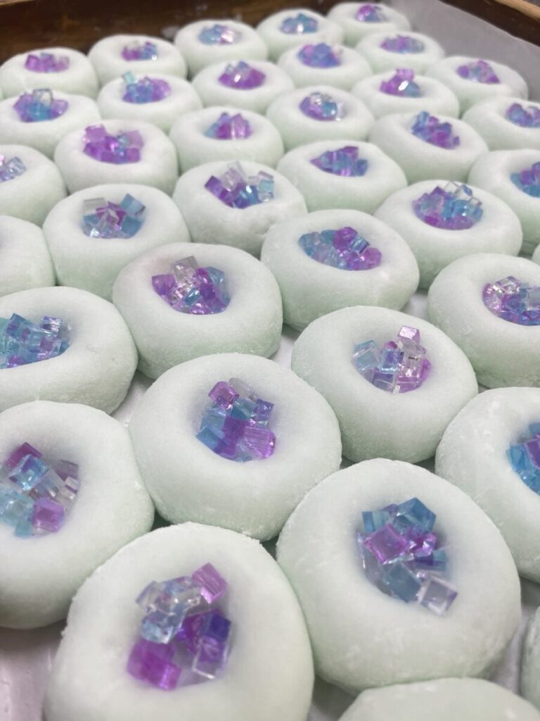 本日ご紹介いたしますのは「紫陽花」をイメージさせる羽二重製の和菓子。