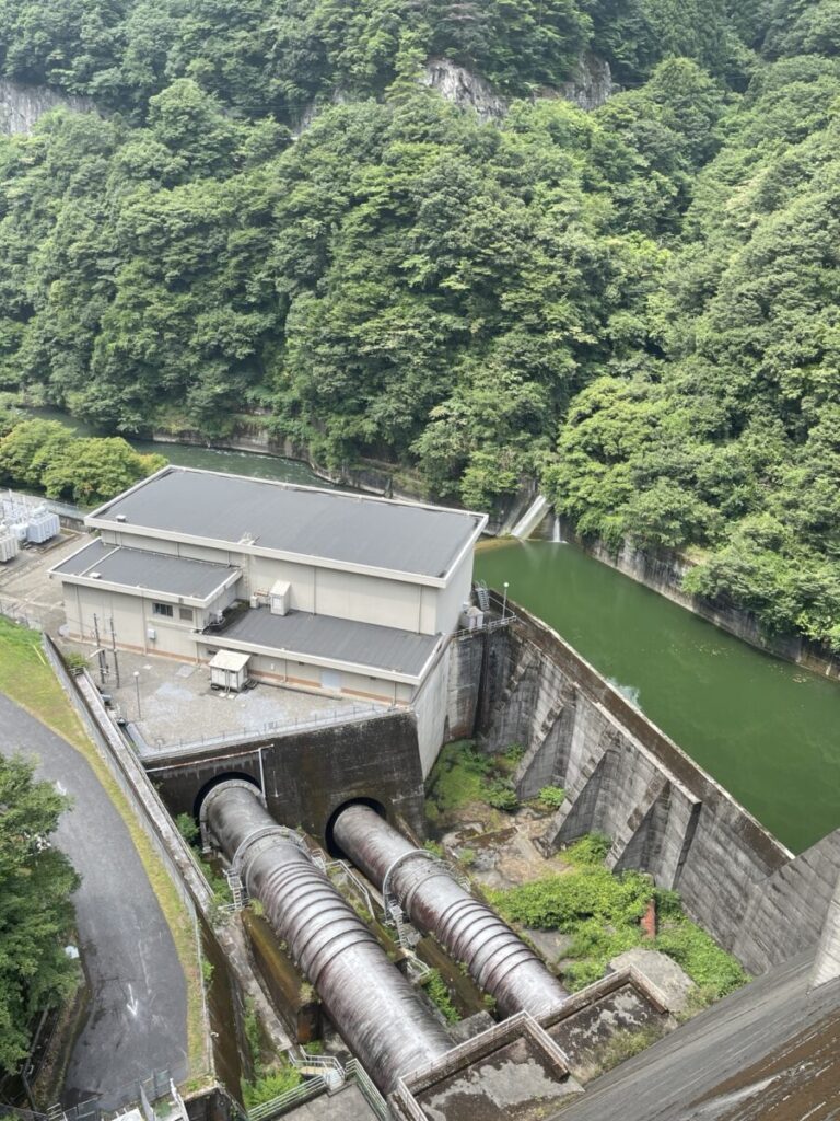 徳山ダムの造りは「ロックフィルダム」という岩石を積んでできていましたが、今回の横山ダムは「重力式コンクリートダム」という写真の通り、ある意味わかりやすい造りです。