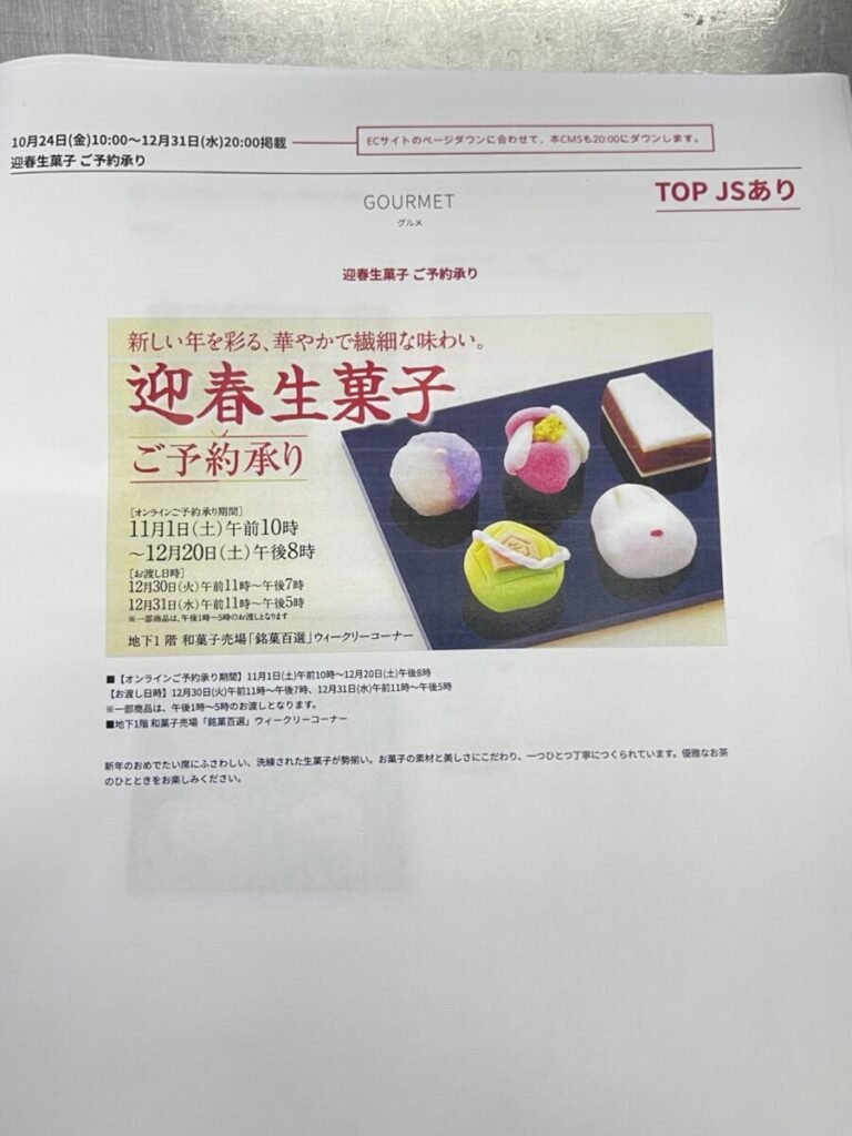 年末に販売いたします「迎春生菓子詰め合わせ」と「花びら餅」は11月1日(土)の10時よりジェイアール名古屋タカシマヤのオンラインページよりご予約がスタートとなります。