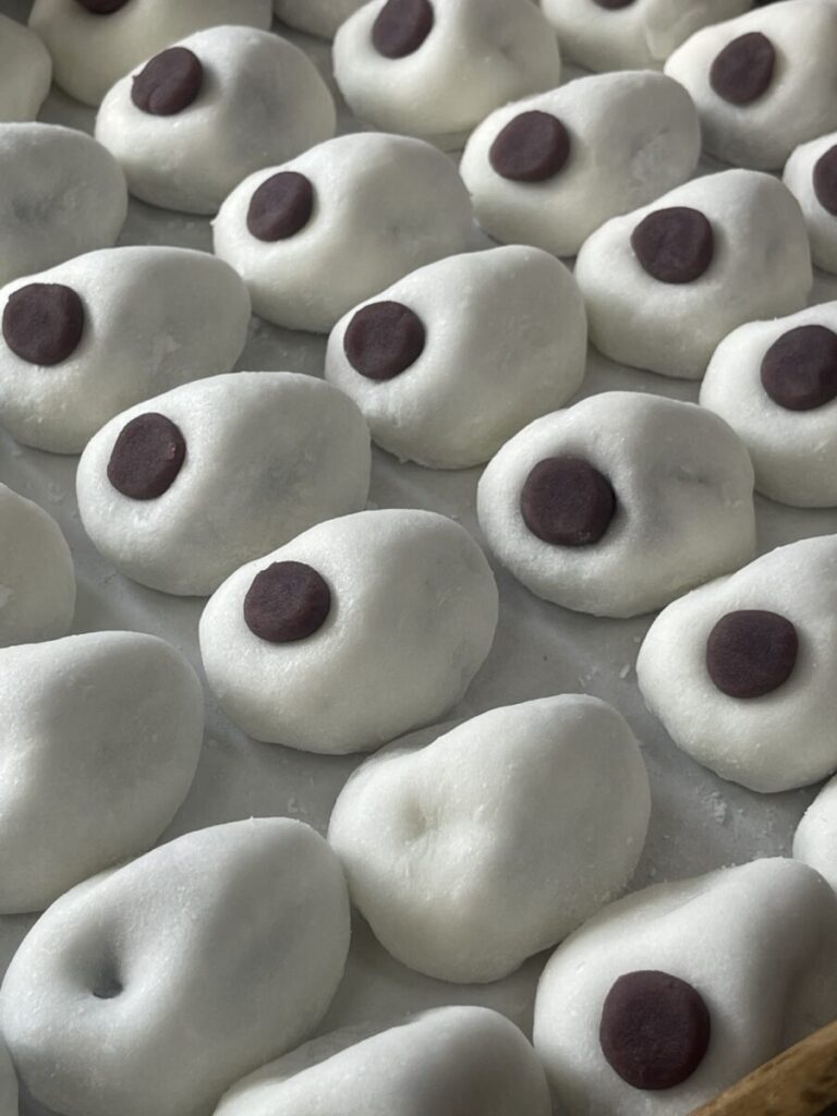 「ころ柿」という銘を付けた羽二重餅製の和菓子をつくっている最中の写真を撮りました。