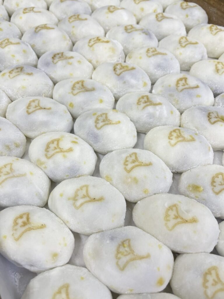 ふっわふわの羽二重餅の生地に、稲沢の特産である「ぎんなん」を細かく割り入れて練り込みました。