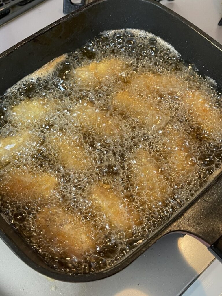 豚のバラ肉の薄切りをクルクルと丸めてカツにする。