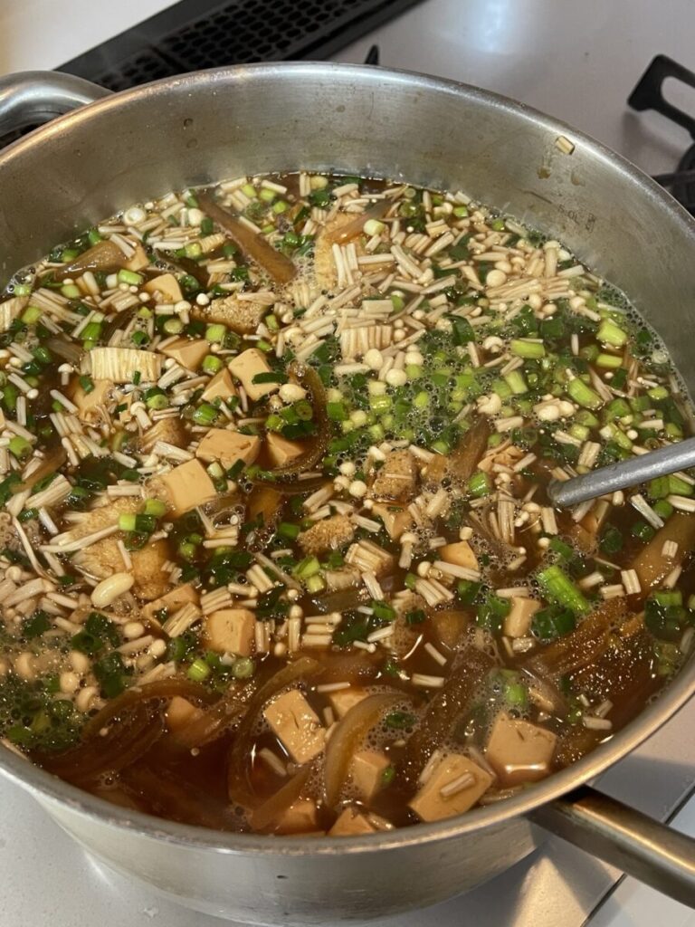 昨日は八丁味噌を使って味噌汁をつくりました。味噌汁とおにぎり、相性抜群です。
