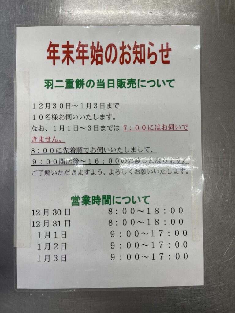年末年始の営業時間、そして羽二重餅の当日販売分につきましてご案内させていただきます。