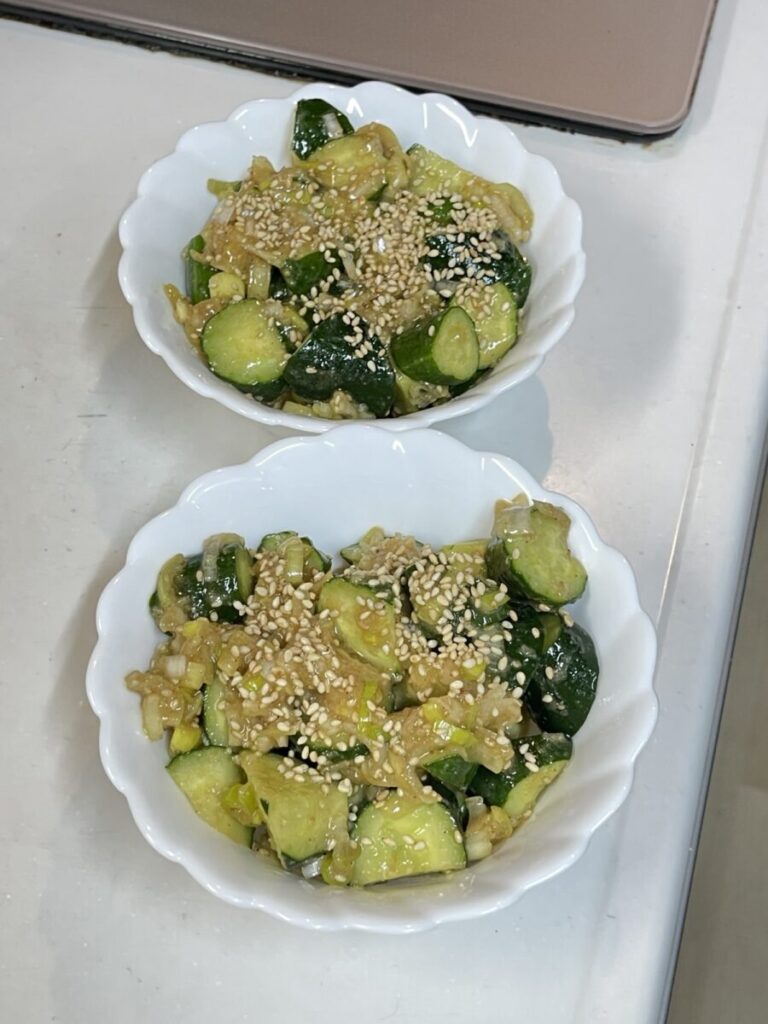きゅうり、すりおろしニンニク、刻みネギ、いりごま、すりごま、塩、醤油少々、最後にごま油。
