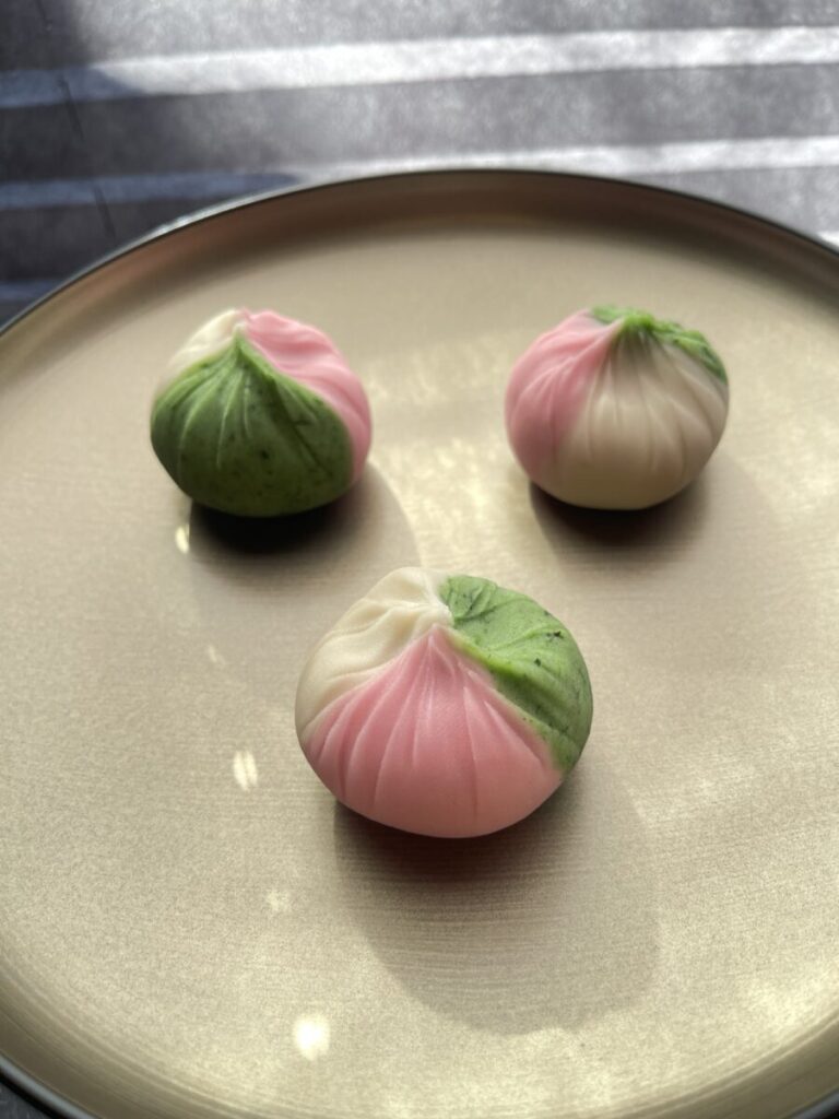 よもぎ入りの緑、白、さくら色の三色でのご用意。
