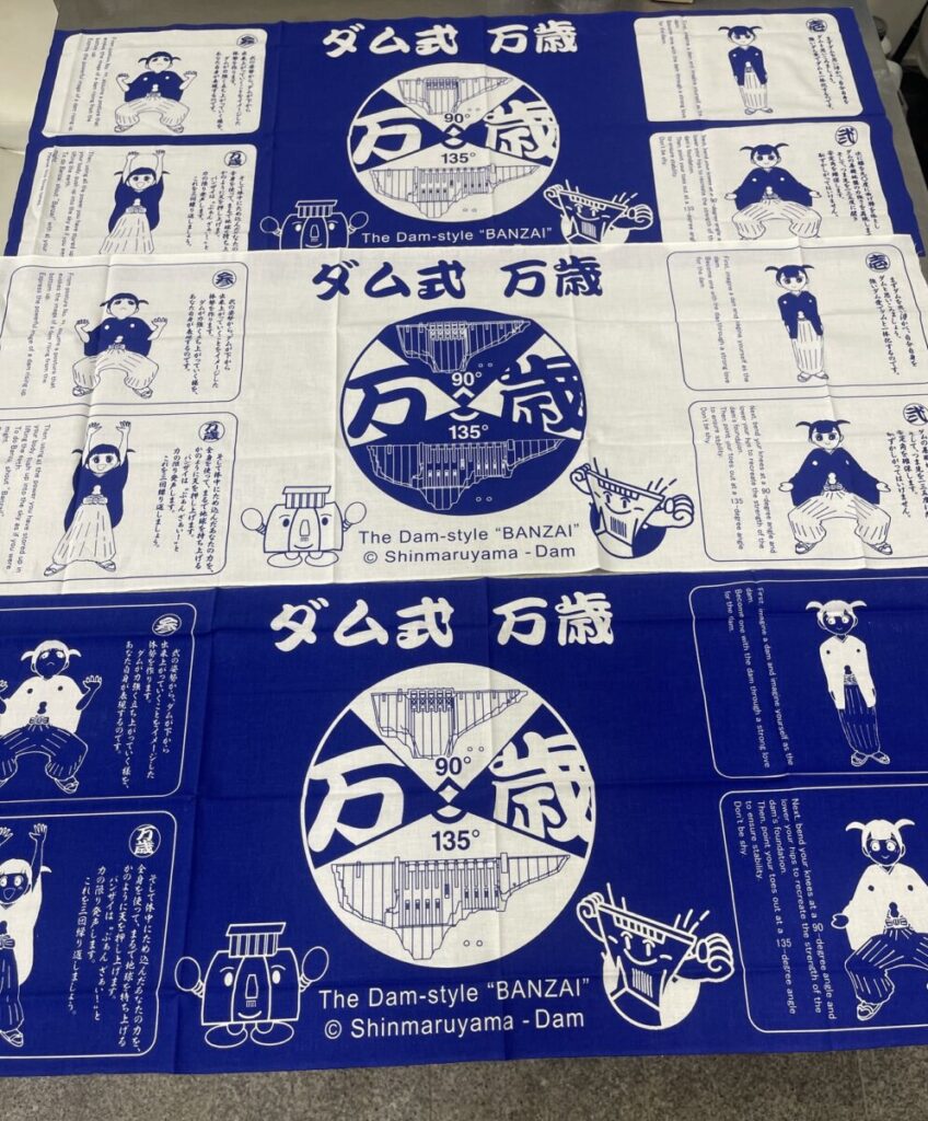 その市長が、最近公式訪問された 「新丸山ダム」の折に配られた手拭いを三種類も届けてくださいました。