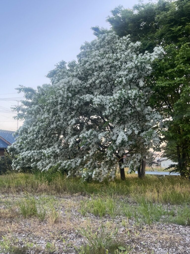 もう一つ。単線の踏切待ちをしている時にふと脇に目を遣るとヒトツバタゴ(なんじゃもんじゃの木)がちょうど満開を迎えておりました。