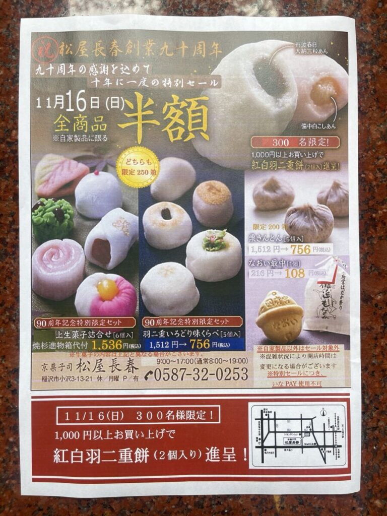 松屋長春は11月15日でまるっと90周年を迎えます。本来ならば11月15日に周年記念のイベントを催したいところですが、日程の都合上11月16日(日)にしました。