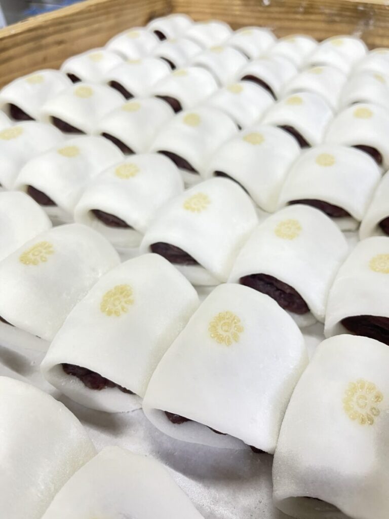 昨日の苦菜と同じくらいのサイズの菊の花の焼印を施した羽二重餅、本日から販売スタートとなりました。これから二週間、こちらの焼印でお願いを致します。ものすごく華奢で可憐な焼印ですので、ぜひご覧下さい。