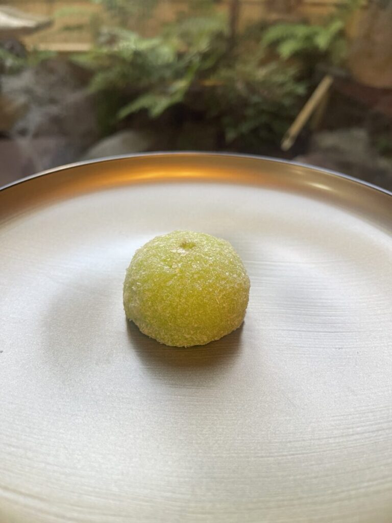 備中白小豆こしあんにたっぷりと柚子の果皮と果汁を含ませて、道明寺の生地で包み込んであります。